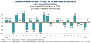 En febrero de 2026 y con cifras desestacionalizadas, el Indicador Global de la Actividad Económica (IGAE) creció 0.1 % respecto al mes previo, en términos reales. A tasa anual retrocedió 0.3 por ciento.