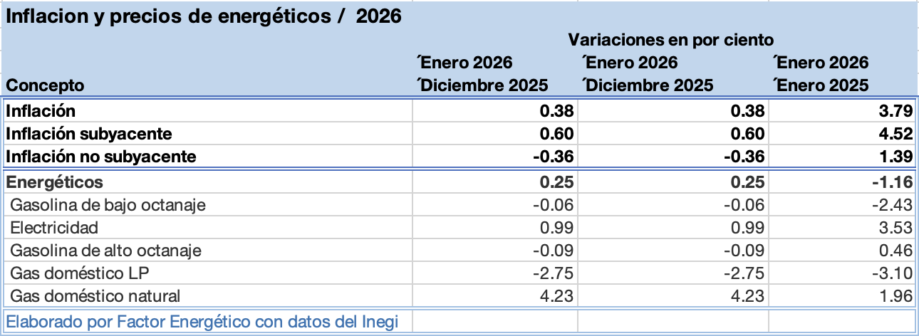 Durante enero de 2026, los precios promedio de los energéticos reportan un ajuste a la baja de 0.25% contra un alza de la inflación de 0.39%.