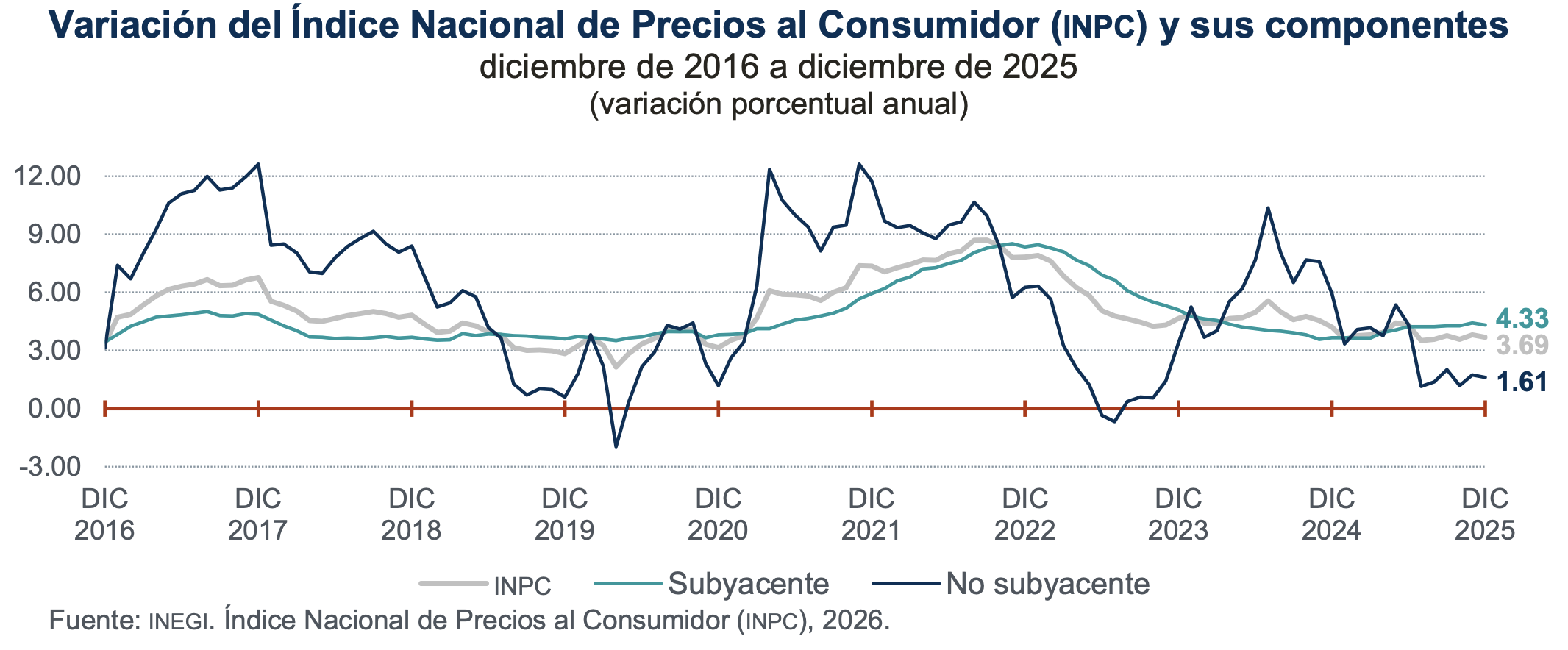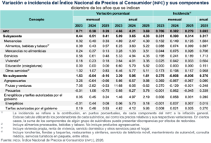 Los economistas del departamento de análisis de Banamex indican que “vemos presiones inflacionarias elevadas en 2026, compensadas parcialmente por la apreciación cambiaria y un crecimiento económico modesto”. “Anticipamos un repunte de la inflación anual a inicios de este año como consecuencia de los efectos de los incrementos a impuestos y aranceles que entraron en vigor el 1 de enero, que impactarían principalmente al componente de mercancías (que luego de mostrar una tendencia al alza en 2025 se había estabilizado).