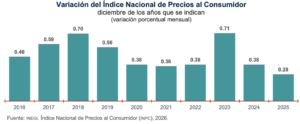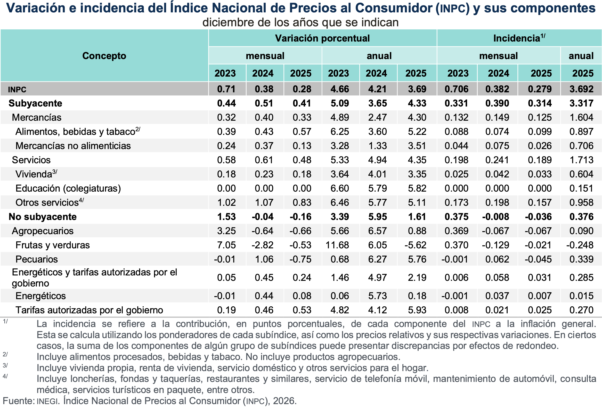 Inflación general anual baja a 3.7% por disminuciones en pecuarios, mercancías no alimenticias y energéticos. Indica el departamento de análisis de Banamex. El INPC registró un incremento mensual de 0.28%, ligeramente por debajo de nuestra estimación (0.31%) y menor al consenso (0.34%), y bastante inferior al promedio histórico (15 años anteriores) para diciembre (0.50%).