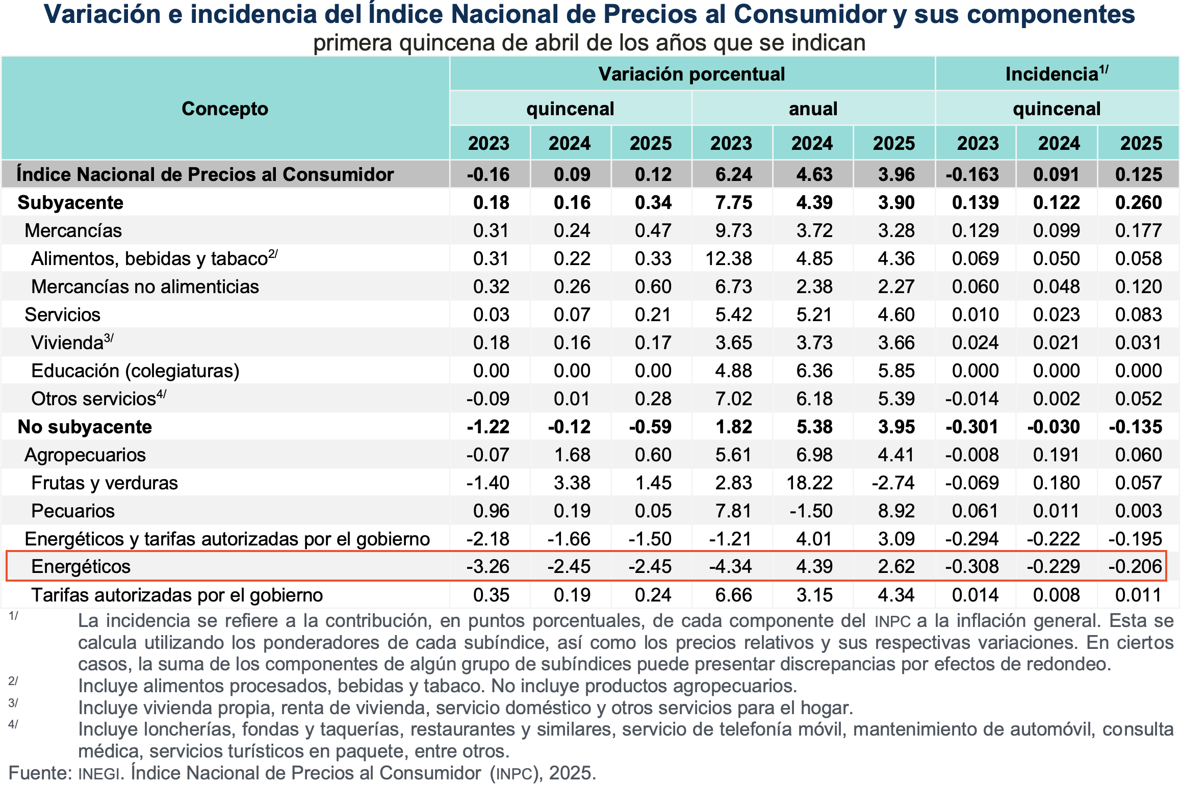Con este resultado, la inflación general anual se ubicó en 3.96 por ciento. En el mismo periodo de 2024, la inflación quincenal fue de 0.09 % y la anual, de 4.63 %.