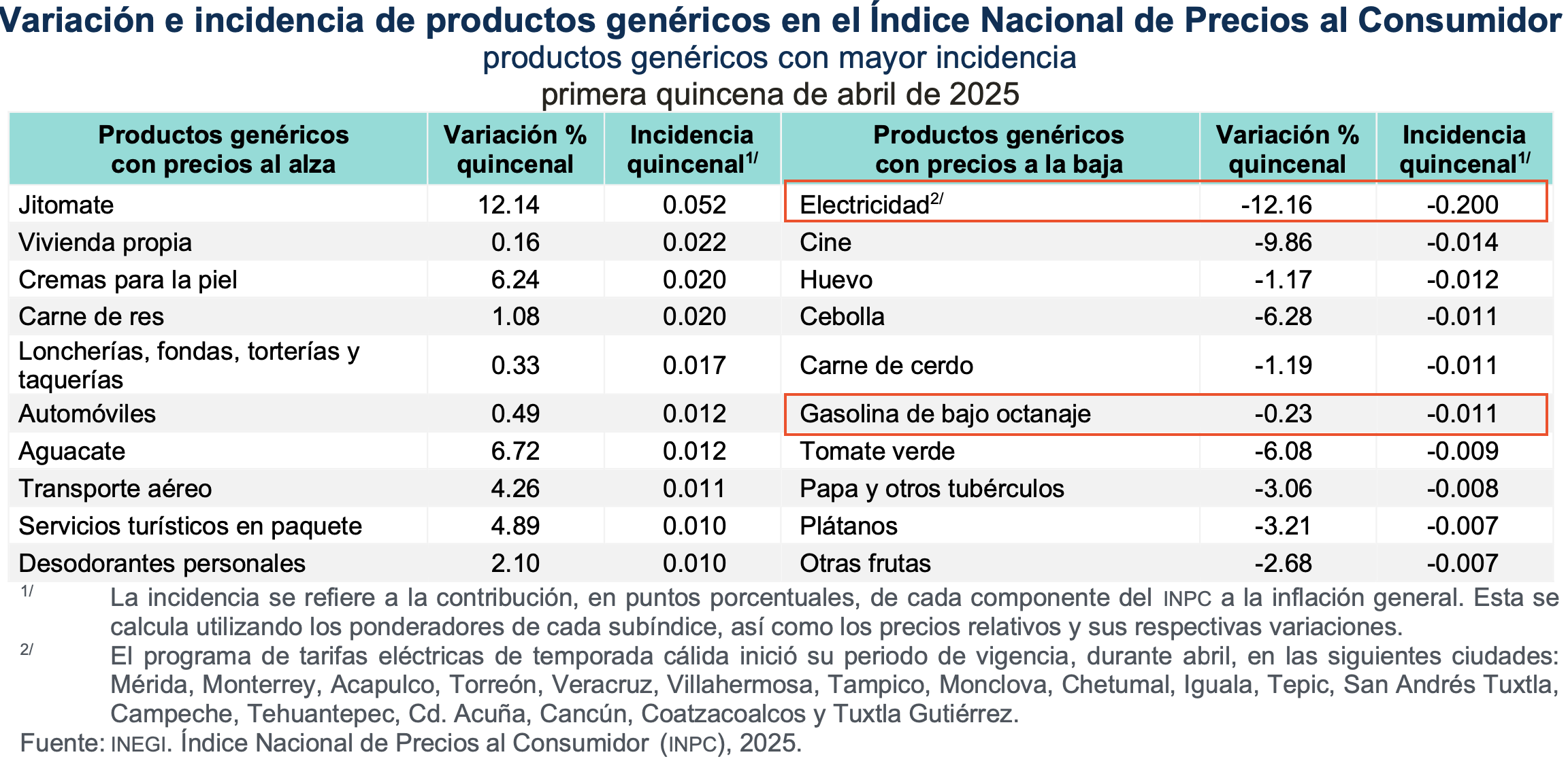 Información del Instituto Nacional de Estadística y Geografía (Inegi) indica que las tarifas eléctricas autorizadas por el gobierno cayeron 12.16%, como resultado de los ajustes en 18 ciudades del país dentro del esquema de temporada cálida, una baja cíclica de cada año.