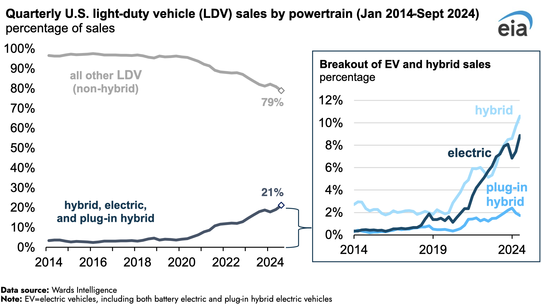 La proporción de ventas de vehículos eléctricos e híbridos en los Estados Unidos aumentó de nuevo en el tercer trimestre de 2024 (3T24), alcanzando un récord. Las ventas combinadas de vehículos híbridos, vehículos eléctricos híbridos enchufables y vehículos eléctricos de batería (BEV) aumentaron del 19,1 % de las ventas totales de vehículos nuevos ligeros (LDV) en los Estados Unidos en el segundo trimestre de 24 al 21,2 % en el tercer trimestre de 24, según estimaciones de Wards Intelligence.