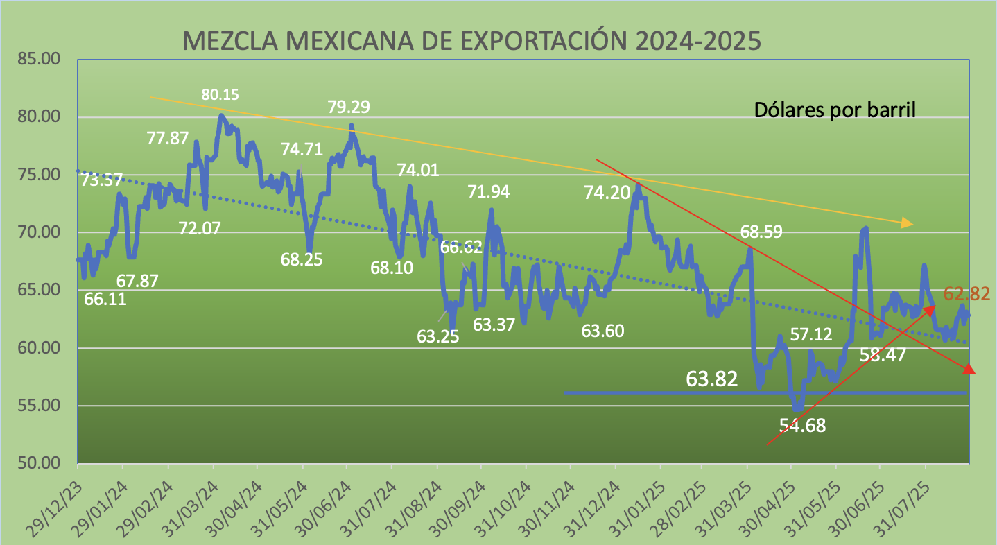 Al cierre de agosto de 2025, el precio de la Mezcla Mexicana de Exportación cerró en 62.82 dólares el barril un poco por debajo del promedio del año de 63.61 dólares, lo que significó una caída de -5.59%, la tercera baja en el año.